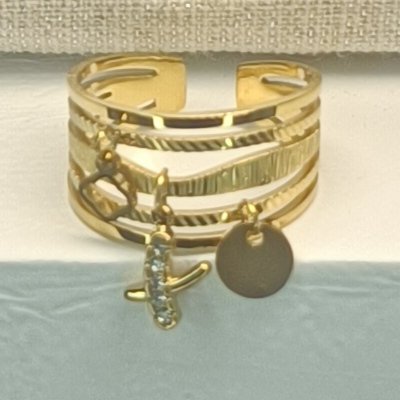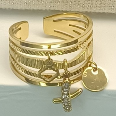 La bague en acier inoxydable doré présente plusieurs éléments décoratifs. Elle possède une large bande avec plusieurs lignes horizontales découpées et des motifs texturés. Trois pendentifs sont suspendus à la bague : un petit disque rond et plat, une forme géométrique , et une petite croix ornée de pierres claires. La bague affiche une allure luxueuse et sophistiquée.